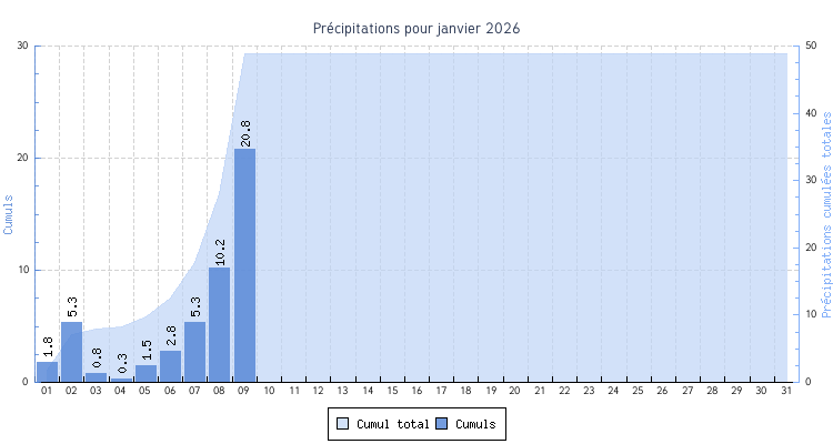 | 09 | 4.9 °C à 11:51 | 8.8 °C à 00:00 | 5.9 °C | 3.4 km/h (54.7 km/h) | 84 |