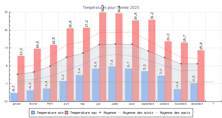 | Mois | Températures min | Températures max | Moyenne mensuelle |