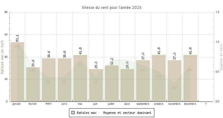 | decembre | -0.8 °C | 5.9 °C | 15.9 °C | 11.7 °C | 9.0 °C | 0.6 km/h | 41.8 km/h | 159 |