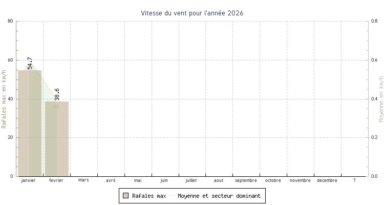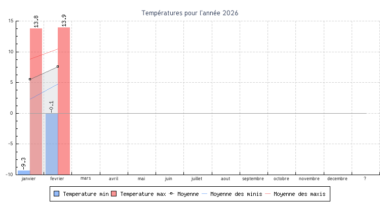 | janvier | -9.3 °C | 2.3 °C | 13.8 °C | 8.8 °C | 5.5 °C | 0.6 km/h | 54.7 km/h | 195 |